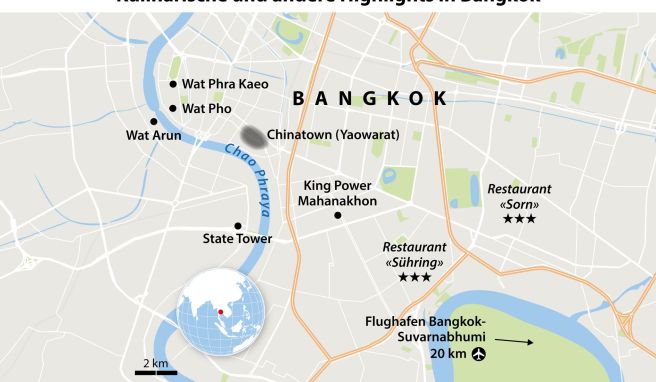 Im Viertel Yaowarat pulsiert das Leben: Straßenstände, Neonlichter und Garküchen machen die Gegend zu einem der besten Orte, um Bangkoks legendäres Streetfood zu probieren. Daneben gibt es hippe Bars und Cafés, die meisten in charmanten chinesischen Shophouses. Eine besondere Empfehlung sind das Restaurant «Ba hao» und die Rooftop-Bar im «Wallflowers Cafe».