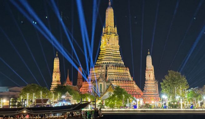 Direkt am mächtigen Fluss Chao Phraya erhebt sich die imposante Anlage des Wat Arun. Besonders bei Sonnenuntergang glitzern seine mit Porzellan verzierten Türme spektakulär über dem Wasser. Am schönsten ist die Anreise mit einer kleinen Fähre oder einem Touristenboot. Magisch ist der Sonnenuntergang vom Wasser oder vom anderen Ufer aus, wenn der Tempel zunehmend in goldenem Licht erstrahlt.