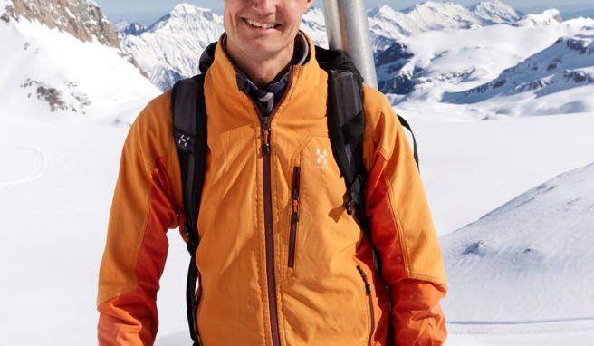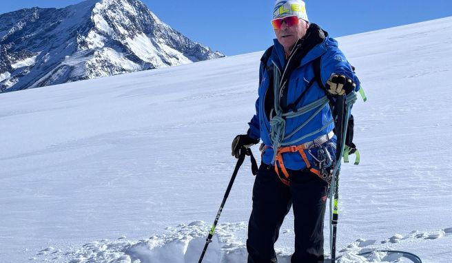 Immer wieder checkt Aldo, ob ich mich an die Seildisziplin halte. Er stochert mit seinen Stöcken im Schnee, tastet vorsichtig mit den Schneeschuhen und ist doch erstaunlich flott. Sein Lehrling ist maximal halb so alt, aber wenn Aldo nicht wartet, können er und seine Gruppe kaum aufschließen - obwohl die Spur schon da ist. Nur ab und zu wartet Aldo und lässt den jungen Kollegen mal spuren, ruft nach ihm, gibt ihm per Armbewegungen Richtungsempfehlungen, beobachtet, was er tut.
