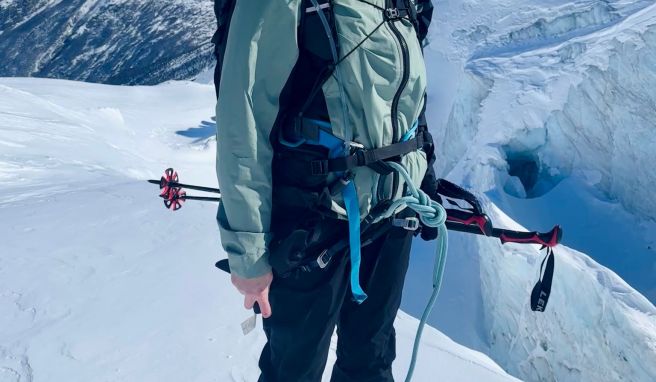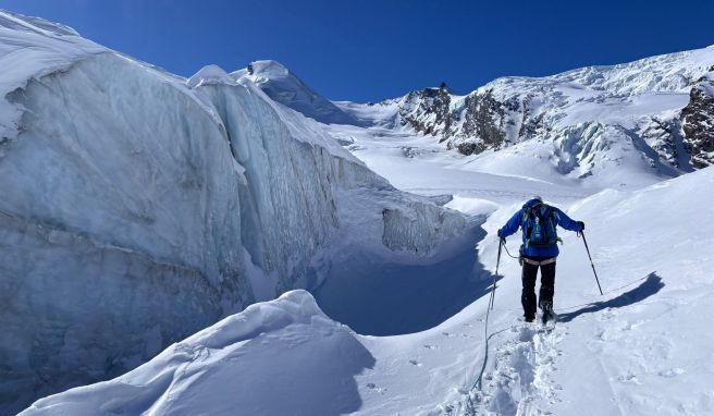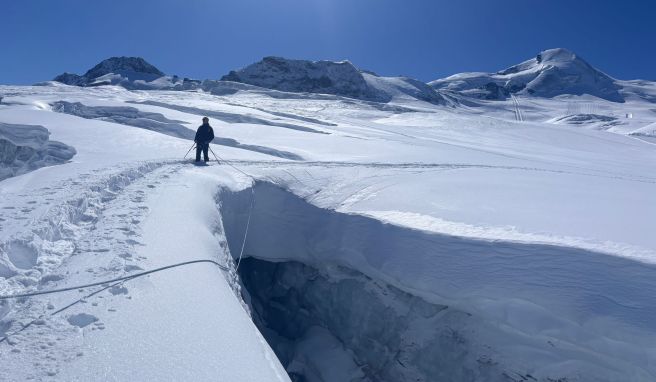 Vorn wird gespurt, hinten ausreichend Abstand gehalten: Eine kleine Seilschaft bahnt sich entlang von Gletschereis den Weg durch den Schnee. Foto: Nathalie Helene Rippich/dpa-tmn