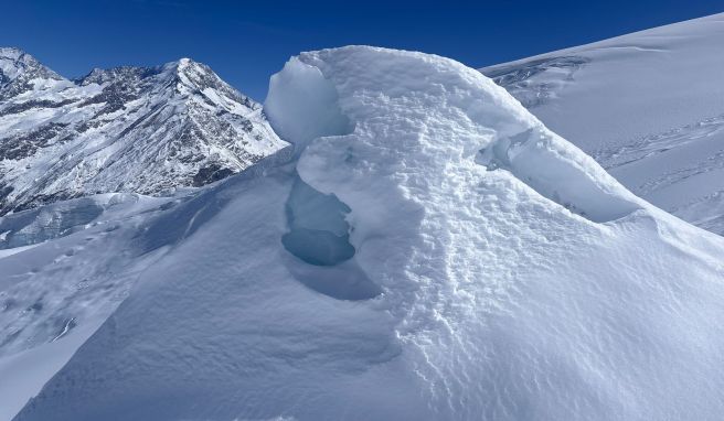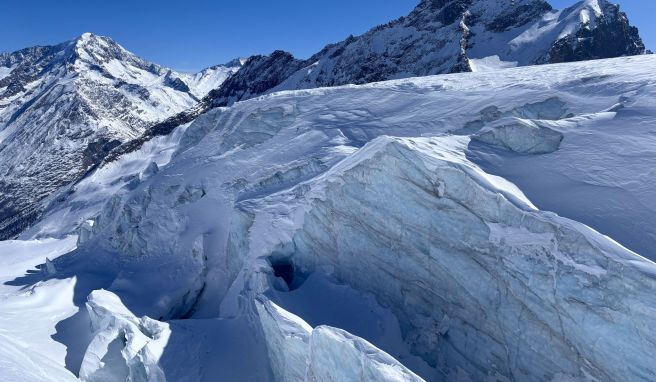 Der Feegletscher, auf dem wir im beginnenden Schweizer Frühling unterwegs sind, bewegt sich am Tag 30 bis 40 Zentimeter, erklärt Aldo. Heißt: Was heute ist, kann morgen schon weg sein - oder zumindest anders aussehen.