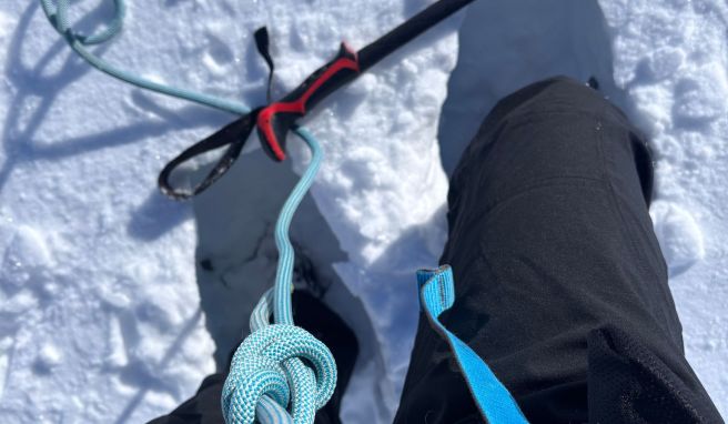Das Seil, das an meinen Gurt geknotet ist, soll ich stets vor mir lassen. «Es kann auf dem Boden schleifen, aber zieh es nicht hinter dir her», sagt Aldo, mit dem ich für die nächsten dreieinhalb Stunden durch ein blaues Band verbunden sein werde. Der 72-Jährige geht voran, «spurt» den Weg für uns.