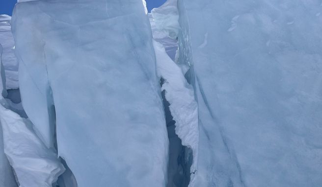 Wir sind etwa eine halbe Stunde durch den kniehohen Schnee gewandert. Während bisher die Schneedecke glatt wie ein frisch bezogenes Bett vor uns lag, zerklüftet die Landschaft nun zunehmend. Erst erheben sich dicke Eisblöcke neben uns, dann, ein paar Meter weiter, geht es steil nach unten - ebenfalls entlang von massiven Eiswänden. Der Blauton ist sehr hell, nah dran an Weiß, aber mit einer faszinierenden Tiefe. Der Schnee liegt als dünne Schicht obendrauf wie Zuckerguss.
