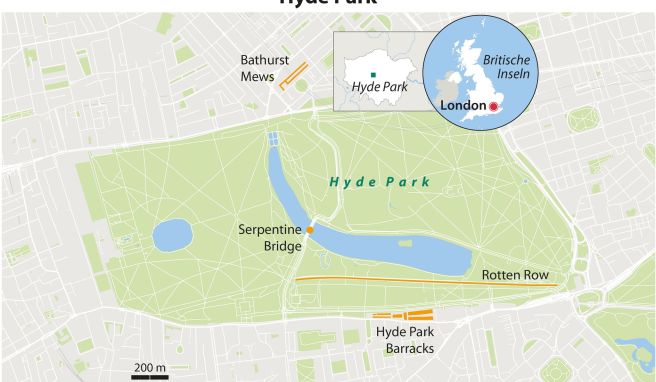 Die zahllosen Hufspuren auf der Rotten Row stammen nicht nur von Freizeitreitern. Südlich an den Park angrenzend sind in den Hyde Park Barracks in einem langgestreckten Bau auf zwei Stockwerken bis zu 300 Pferde der royalen Garde-Kavallerie untergebracht. Stets in den frühen Morgenstunden werden sie im Park trainiert, erzählt Sophie. Ebenso wie die Kutschpferde der «Royal Mews» und jene der berittenen Polizei. Auf den acht Kilometern Reitweg des Parks dürfte dann eine Pferde-Rushhour herrschen.