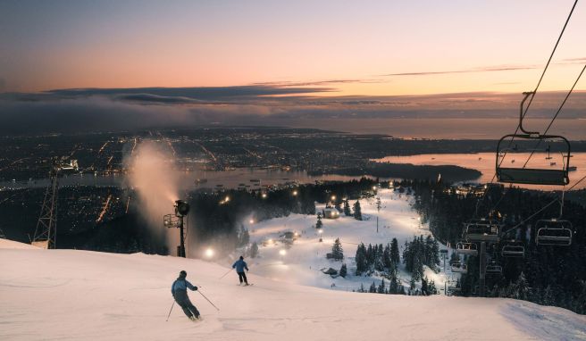 «Ist das nicht einzigartig?», fragt Luisa Staudt, als die Dämmerung über den Grouse Mountain hereinbricht. 1.231 Meter hoch über Vancouver steht die junge Skilehrerin aus Deutschland an der Bergstation des Peak-Sessellifts und zeigt hinunter ins Tal. Der Blick schweift über verschneite Pisten und weiß gezuckerte Tannen. Unten glitzern die Wellen des Burrard Fjords im Abendlicht, dahinter leuchtet Vancouvers Hochhaus-Skyline, die sich markant vor den umliegenden Bergen abzeichnet.