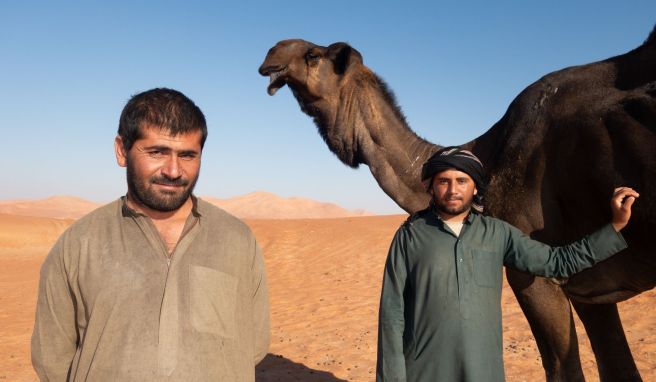 Einige Fahrstunden entfernt, irgendwo im Nirgendwo, leben Shear Ahmed (27, vierfacher Vater) und Nasir Ahmed (21, Single) – zwei Kamelhüter aus Pakistan, die zu einem Viererteam gehören, zuständig für 250 Kamele. «Das sind Nomaden der Moderne», urteilt Guide Al Mahri und setzt lapidar hinzu: «Omanis würden diese Arbeit nicht machen.»