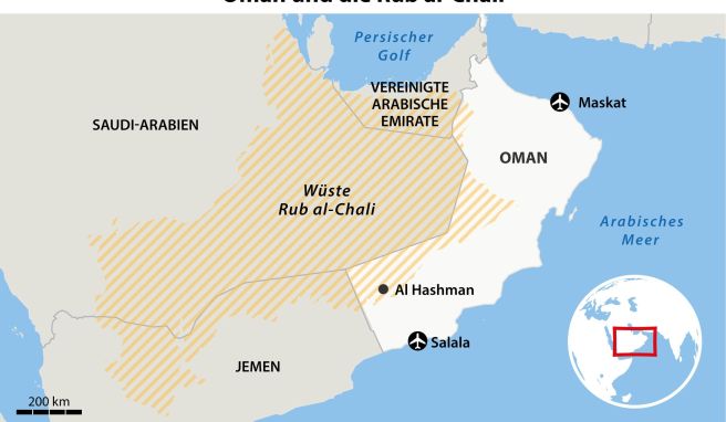 Reiseziel: Das 309.500 Quadratkilometer große Sultanat Oman liegt auf der Arabischen Halbinsel, die Rub al-Chali im tiefen Südwesten; der Einstieg in die Wüste ist etwa 250 Kilometer von der Küstenstadt Salala entfernt.