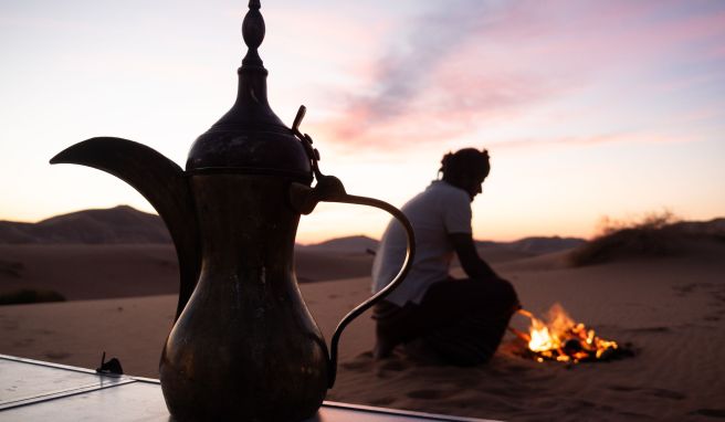 Morgenstimmung in der größten Sandwüste der Welt. Die Szenerie um das Zelt ist wie ein Gemälde. Dünen tragen die Goldüberzüge des Lichts. Die Rücken und Spitzen steigen zum Blauhimmel auf. Über Nacht hat der Wind den Sand neu gemasert. Ein Stück abseits sitzt Guide Mohammed Mussallem Al Mahri neben dem Geländewagen und bereitet das Frühstück vor.
