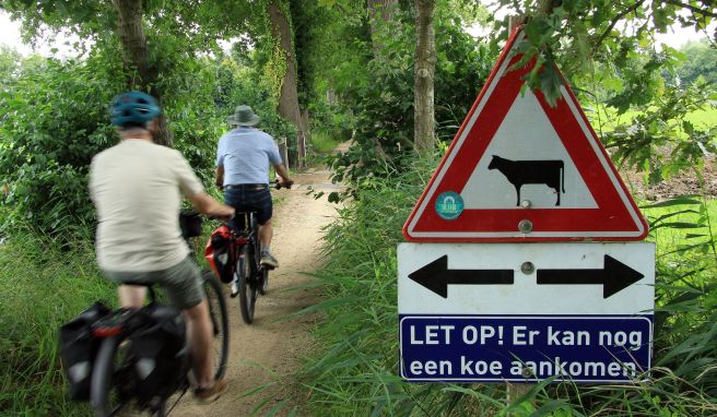 Ja, was ist das denn? «Let op! Er kann nog een koe aankommen» – «Aufgepasst! Es kann noch eine Kuh kommen», warnt ein Verkehrsschild am Radweg zwischen dem Städtchen Borculo und dem Dorf Geesteren. Wie bestellt trottet schwarzbuntes Milchvieh von einer Weide quer über die Radpiste zur gegenüberliegenden Wiese.