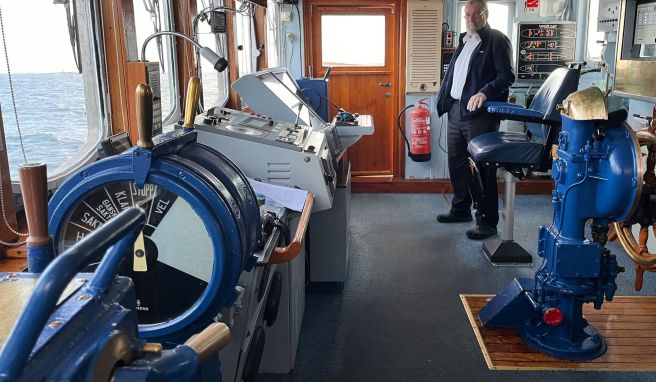 Auch auf der Brücke sind die funktionsfähigen Steuer- und Messinstrumente aus dem Jahr 1956 erhalten. Zu erkennen sind sie an der blauen Farbe. Genutzt werden zusätzlich moderne elektronische Seekarten, Radar und Echolot.
