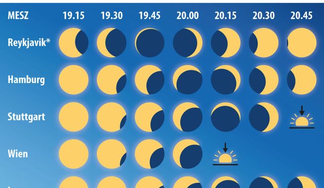 Auf Island bieten sich die Halbinsel Snæfellsnes und die Hauptstadt Reykjavik an. Je nach Standort beginnt die totale Finsternis im Westen der Atlantikinsel ungefähr ab 19.45 Uhr (MESZ; 17.45 Uhr Ortszeit) und dauert teils mehr als zwei Minuten. Die exakten Zeiten kann man sich unter https://eclipse2026.is/where-to-see sekunden- und standortgenau auf einer Karte anzeigen lassen.