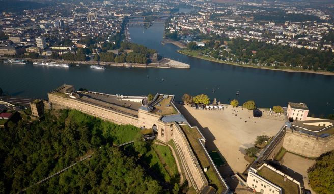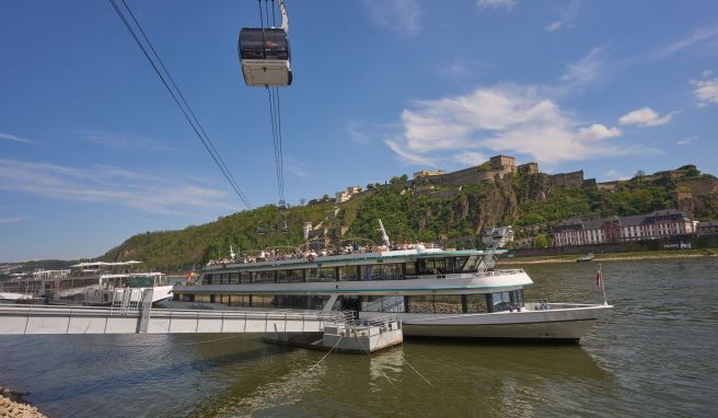 Die Festung Ehrenbreitstein ist denkbar leicht erreichbar: Seit der Bundesgartenschau 2010 befördert eine Seilbahn Passagiere binnen vier Minuten quer über den Rhein zu der Anlage, die bei Koblenz über Stadt und Fluss wacht.
